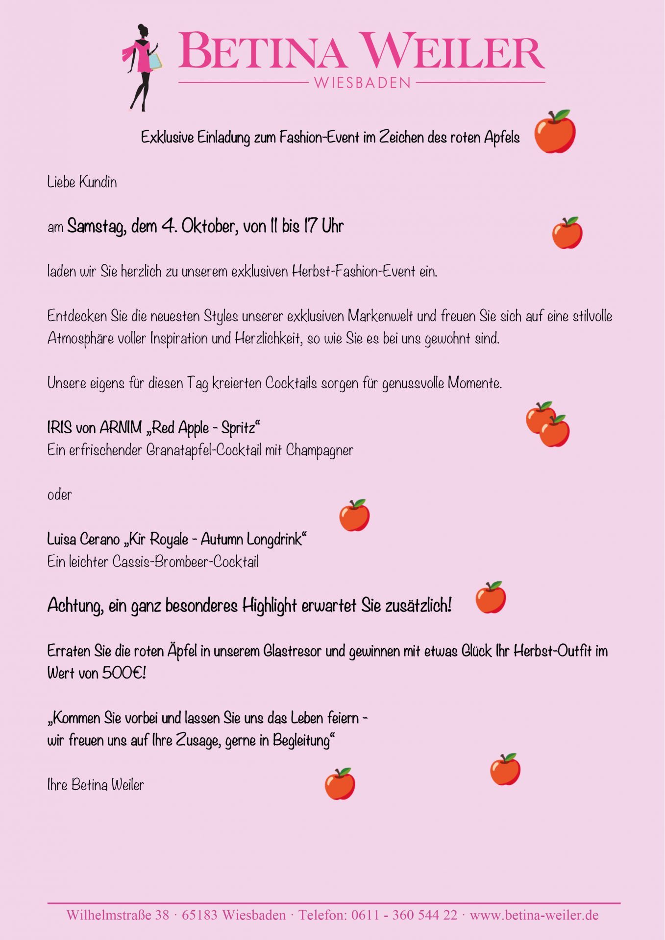 EXKLUSIVE EINLADUNG | 4.10.2025 | 11-17 Uhr Posted on 30. September 2025 by uhde in Allgemein Tagged as 2025, Apfel, Betina Weiler, Einladung, Fashion-Event, Rabatt