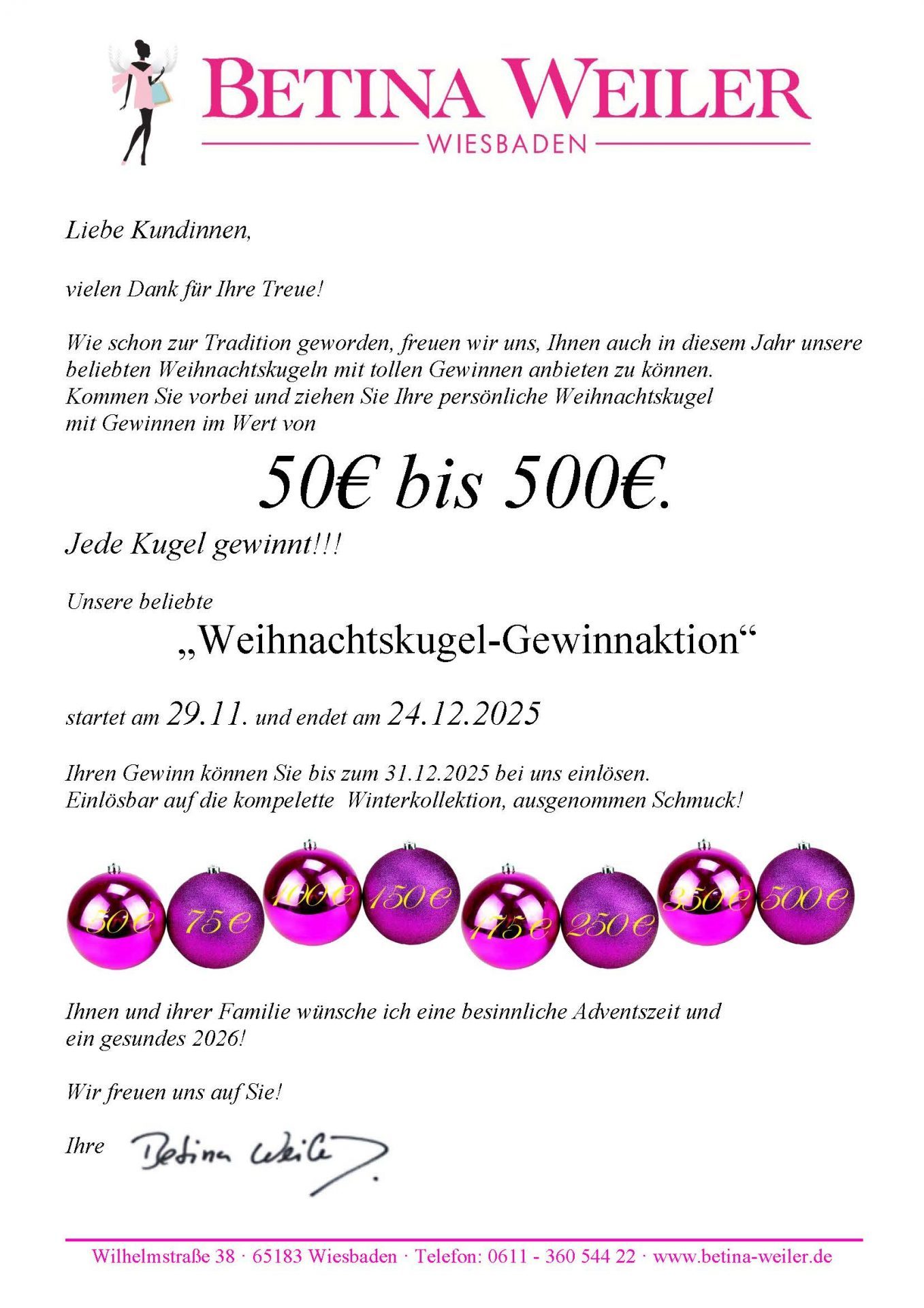 WEIHNACHTSKUGEL-GEWINNAKTION | 29.11.-24.12.2025 Posted on 23. November 2025 by uhde in Allgemein Tagged as 2025, Betina Weiler, Gewinnaktion, Weihnachten, Wiesbaden